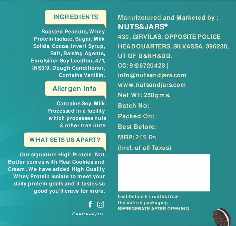 India’s 1st High Protein Cookies and Cream Peanut Butter is filled with goodness. Where usual nut butters contain whey protein concentrate Nuts&Jars nut butters contains Whey Protein Isolate.